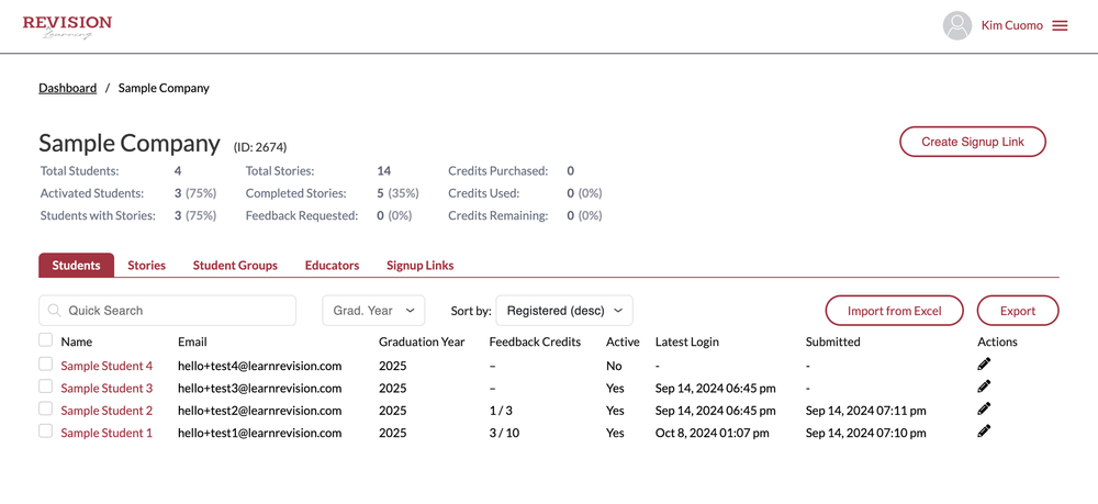 Within the dashboard, educators have the ability to create and edit their students’ accounts, view their students’ feedback, and more.