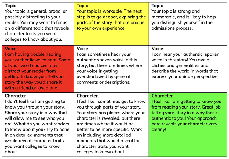 Our distinctive feedback process for drafts, which includes a personalized letter, a score based on our finely-tuned rubric, and targeted, actionable in-line comments from a trained Revision coach. Students submit their drafts on our platform and get feedback there within 48 hours (Starting at $50/round of feedback)