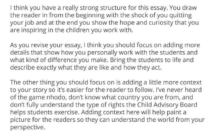 “I was really worried about my essay, especially because of the topic I was writing. I wasn't sure how it was going to turn out at all. But with the feedback I got, I was more confident in what I was writing and I feel more comfortable in submitting my essay. Thank you.”